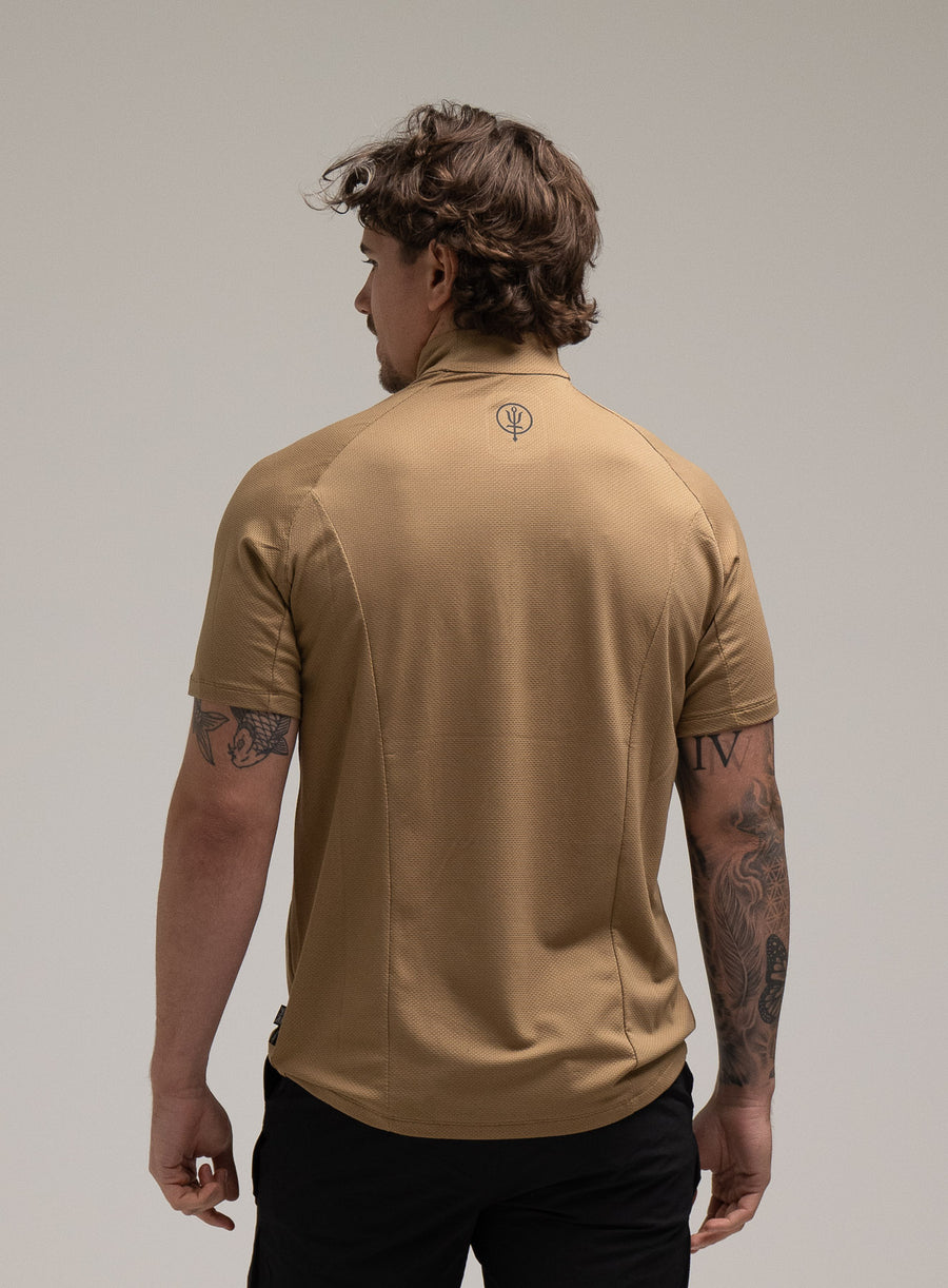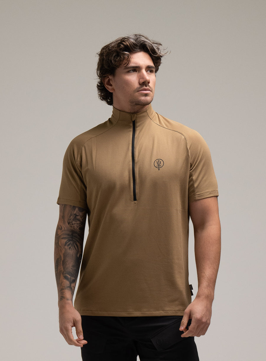 Men's brown breathable half-zip t-shirt for hot weather